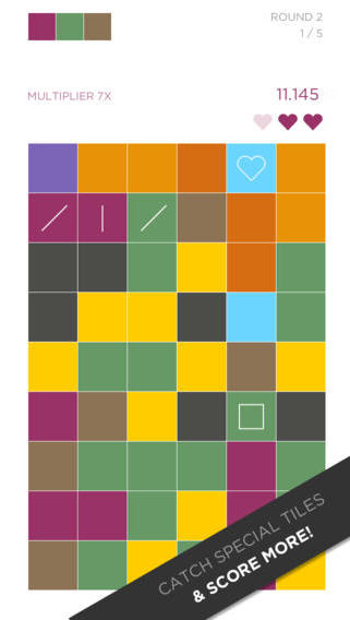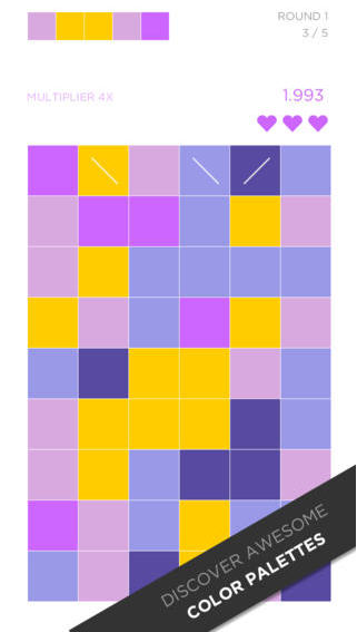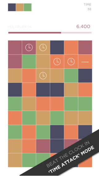 在众多的色块中,找到根据左上角的色块顺序排列的色块,并且划过它们将其消除,横着竖着斜着都可以,但是在这么多的颜色中,要找到符合顺序的组合可不是那么容易的哦。游戏有普通和计时两种模式,看看你能在缭乱的缤纷世界中坚持多久吧。