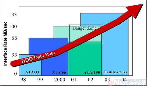 在过去的10年中,作为计算机核心组件的处理器一直都精确的按照摩尔定律向前发展,芯片集成度每18个月翻一翻,处理器性能大幅度攀升,内存技术和图形技术的发展也是日新月异,尤其是图形领域的技术革新远快于处理器,然而并非所有部件都能保持如此高的发展速度,最典型的就是硬盘性能。在接口方面,硬盘的技术提升还算积极,从ATA-33到ATA-66,ATA-100和ATA-133,再到现在的SATA 150,SATA 300标准,硬盘的接口传输速率提升了近10倍,当前最新的SATA 300标准可以提供300MB/S的接口传输速率,理论上传输1G的文件,只需要3.3秒,加载数据,启动系统,开启程序缓慢的情况将不可能发生。